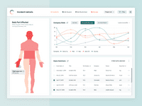 Today we present you the screen where a construction company can select his projects and can get an overview of all the injuries that are reported. On the top bar he can see the most important statistics and the user can use advanced filters to narrow down the data. On the left you see an interactive illustration of the most important filter - the body parts. A rollover gives quickly the data of the injuries on that part and a click on the body part will activate the particular filter.